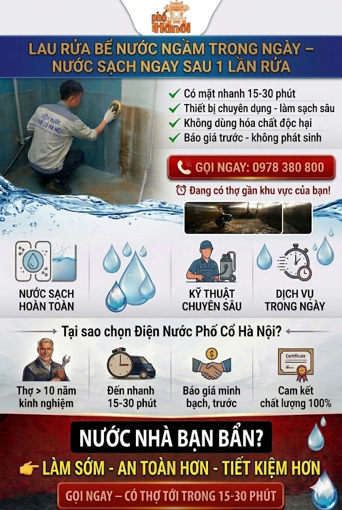 Với 12 cửa hàng tại Hà Nội, cùng đội ngũ kỹ thuật viên hơn 20 năm kinh nghiệm, chúng tôi mang đến dịch vụ thau rửa bể nước ngầm nhanh, sạch, quy trình rõ ràng và có bảo hành.